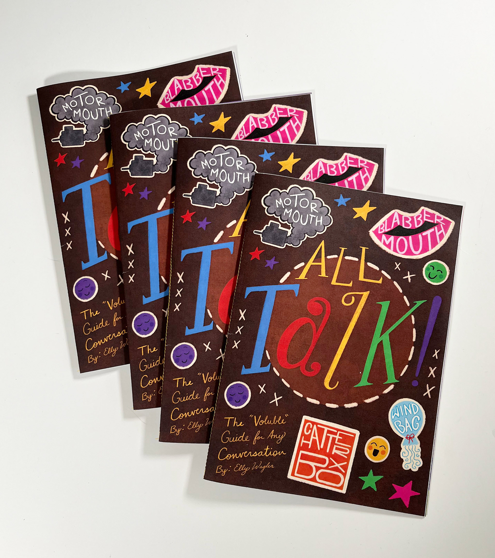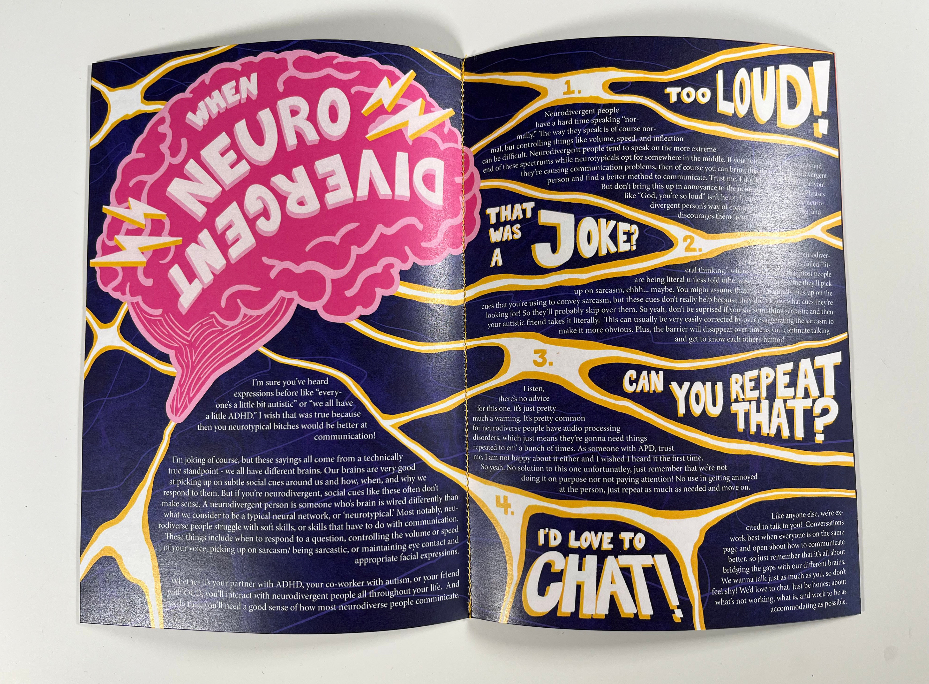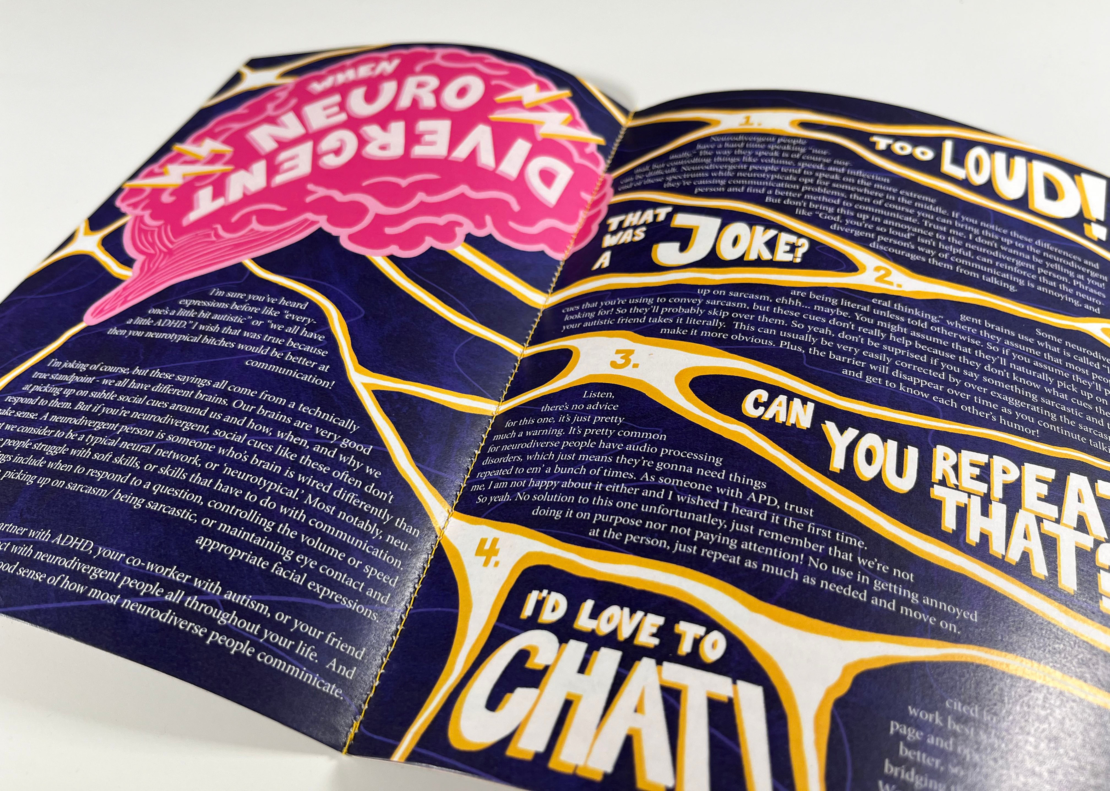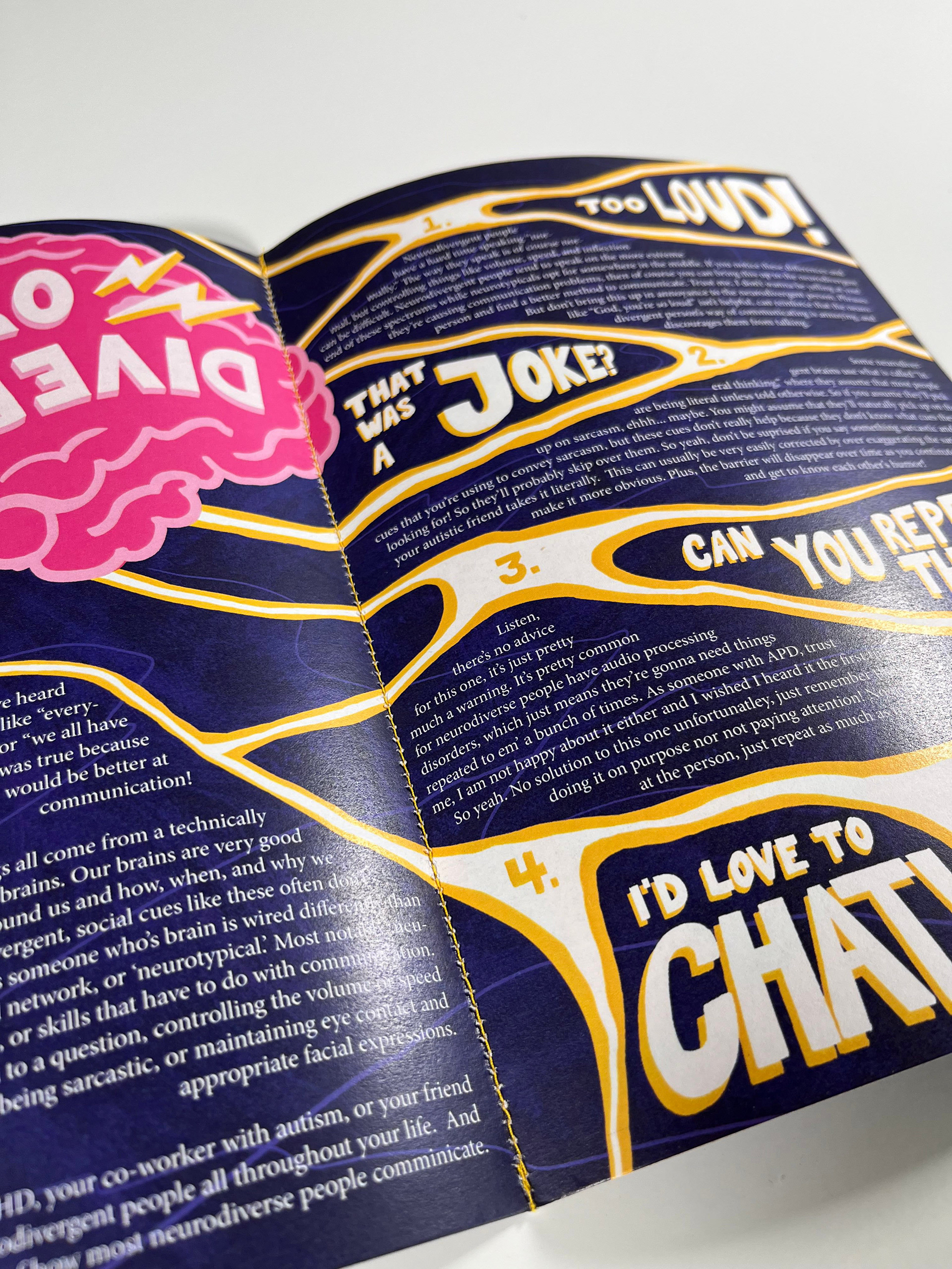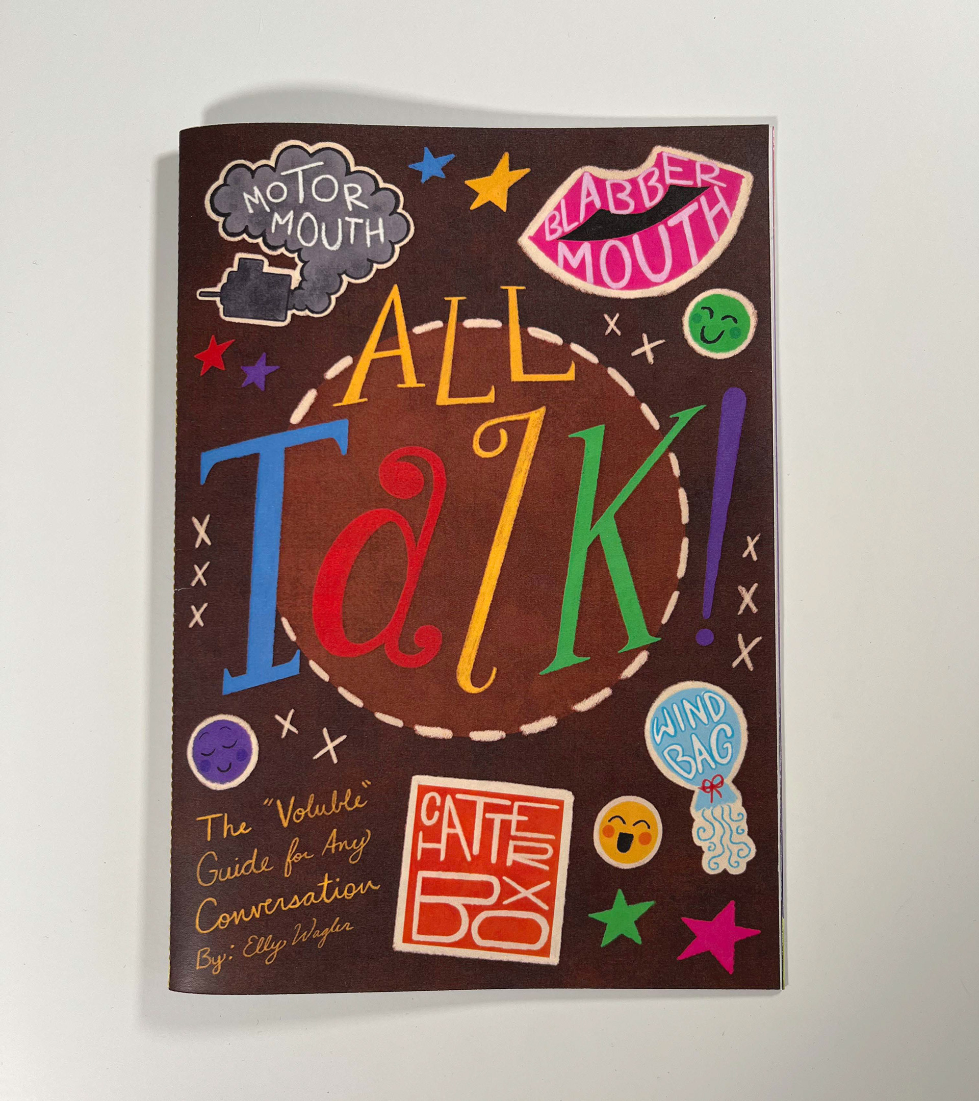 This was an exchange project we did for my first semester in the BFA. We were supposed to make 20 editions of whatever we wanted to give to each of our classmates, with the stipulation that it had to be physical deliverable that we could hand to someone on the day of the exchange. I decided to make a guide on the art of conversation and linguistcs called All Talk!, which leads the audience through different possible scenarios they might find themselves in when talking to someone and what they should do to make the conversation flow smoothly. The books touches on all the different ways people communicate and why, from neural differences, body language, and even different languages. I made most of the illustrations in either Illustrator or Procreate, but largely used InDesign for the text placement. I had a lot of fun creating each spread for each kind of communication style, and I really enjoyed the reactions of my class as I gave them their present! It was very rewarding to not only create the book from scratch, but print and bind the book as well with the help of my grandma and her sewing machine.